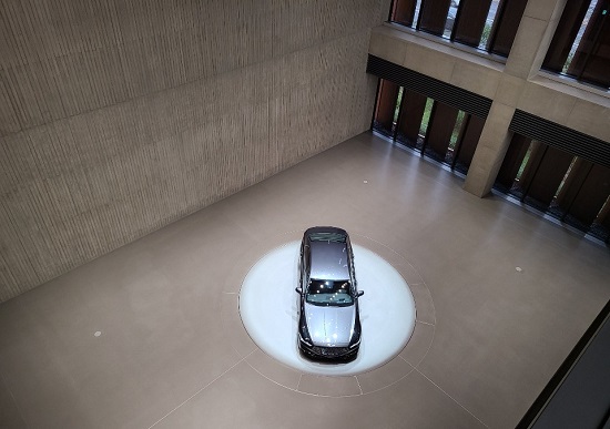 1층부터 3층까지의 한쪽 벽면을 가득 채운 수납형 차량 전시관 '카 타워(Car Tower)'에는 16대의 제네시스가 전시돼있다. 내부가 훤히 보이는 투명한 유리 벽면과 3층 높이의 높은 층고는 시원한 개방감을 전해줬다. 김민주 도슨트는 "설치미술을 보는 듯한 '카 타워'에는 32개 슬롯이 있고, 오늘은 절반만 채워져 있다"고 설명했다.