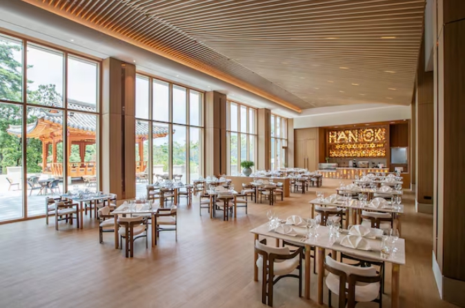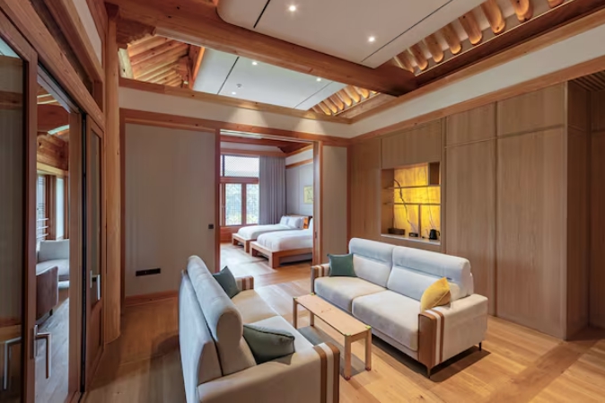 객실 내부는 차분한 목재 톤과 공간감 있게 설계되어 있으며, 산과 강이 담긴 풍경이 창 너머로 펼쳐져 동양 수묵화처럼 감상하게 한다.
