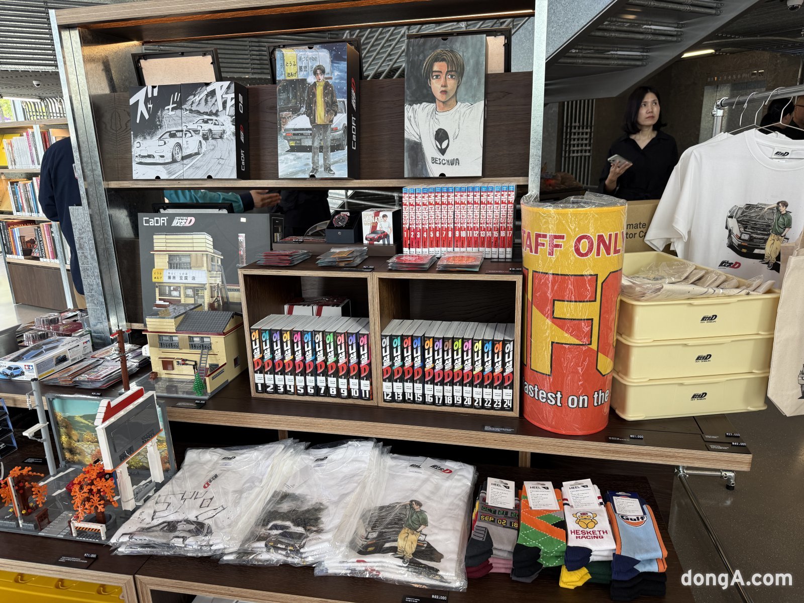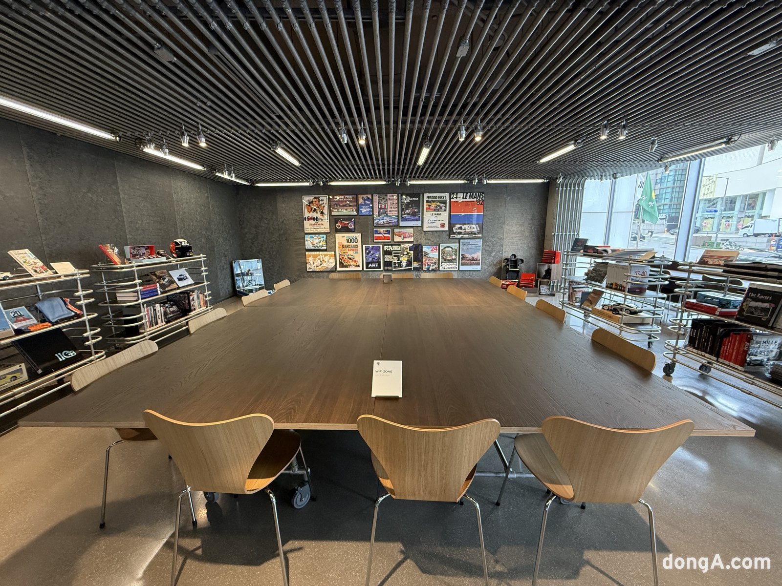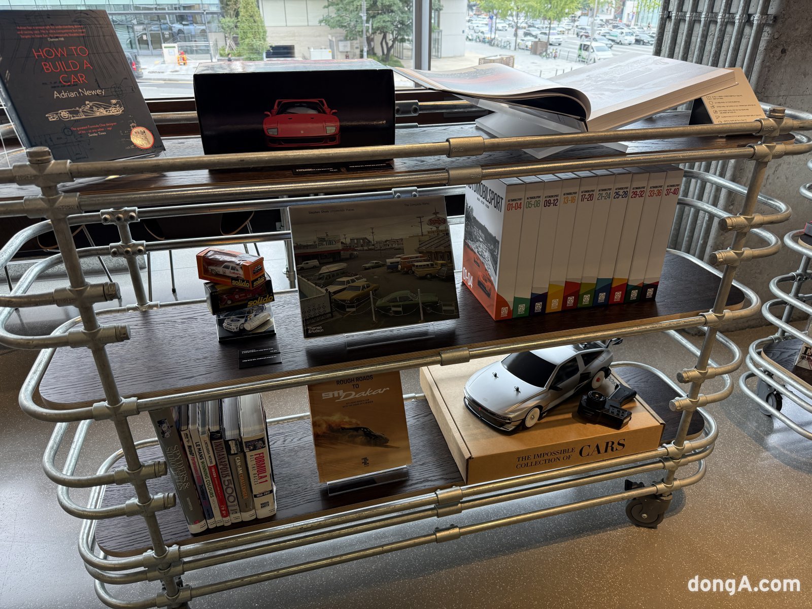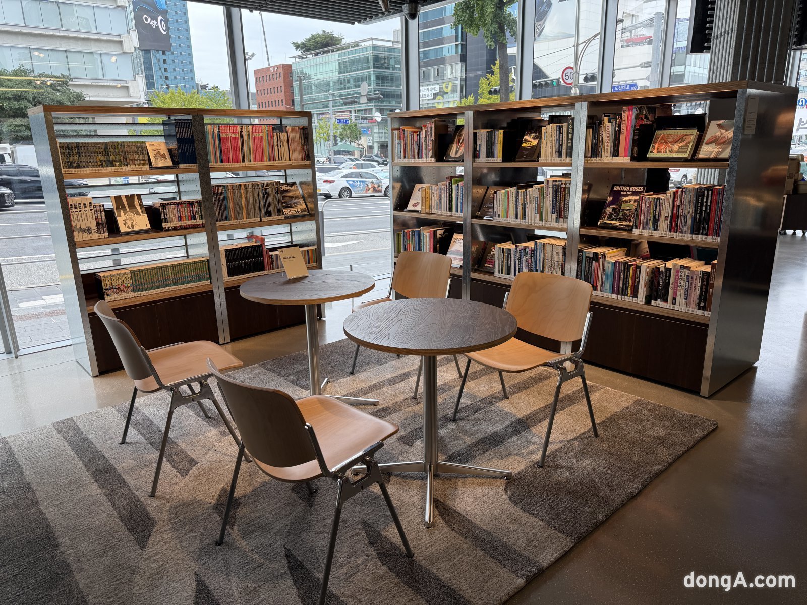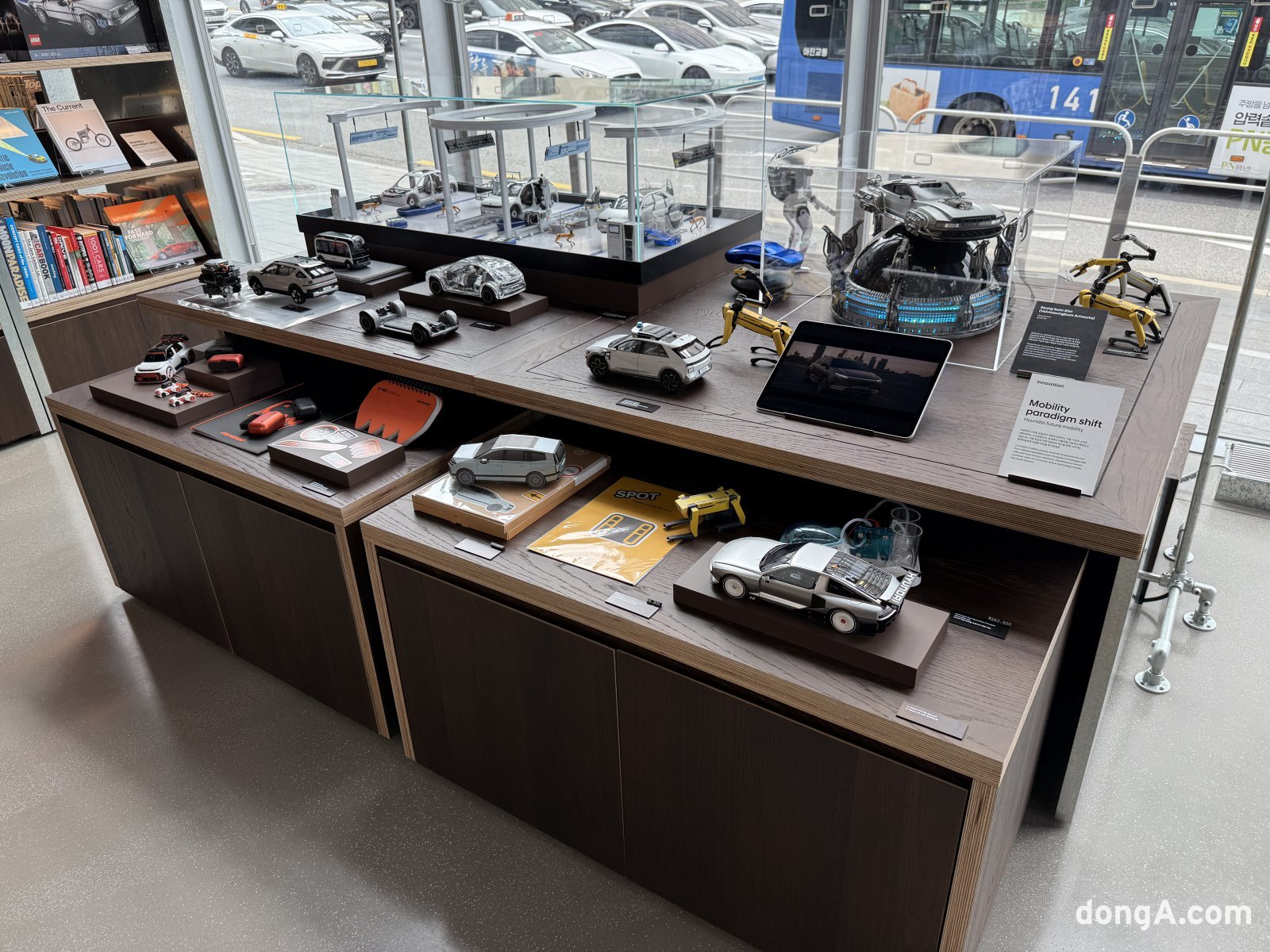 1층과 2층은 일본 츠타야 서점 운영사 CCC와 협업해 ‘오토라이브러리’로 꾸며졌다. 약 2500권의 자동차 전문 서적과 500여 개의 아이템이 감각적으로 전시되어 있다. 자동차의 역사와 디자인, 레이싱 문화, 미래 모빌리티를 담은 책들이 주를 이루고 있으며, 곳곳에는 아웃도어·여행·캠핑 등 자동차 라이프스타일과 연결된 서적들도 볼 수 있다.