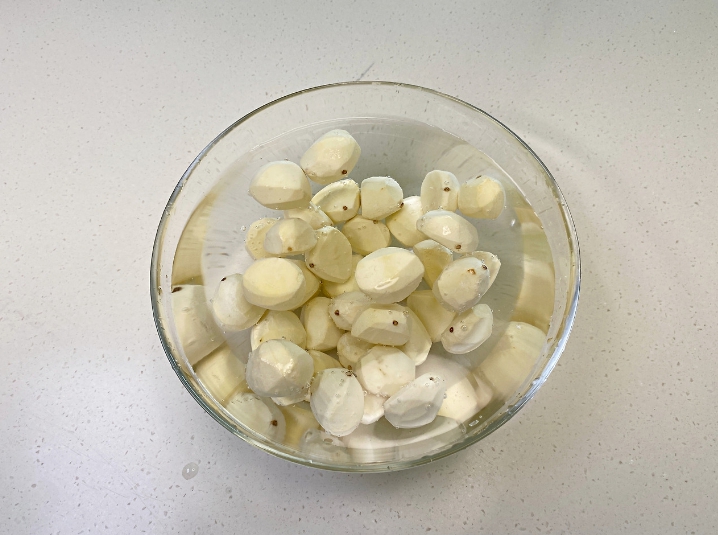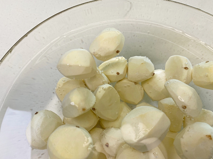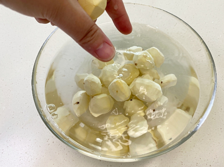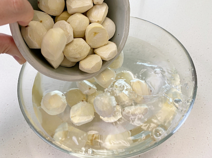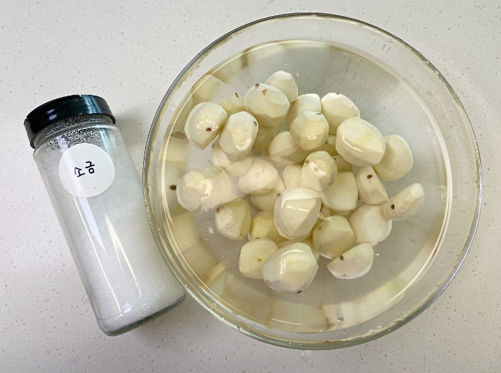 여기에 껍질 깐 밤을 퐁당- 담가요.