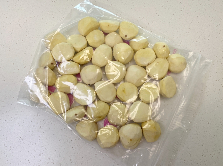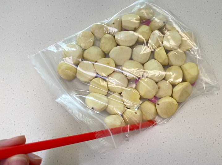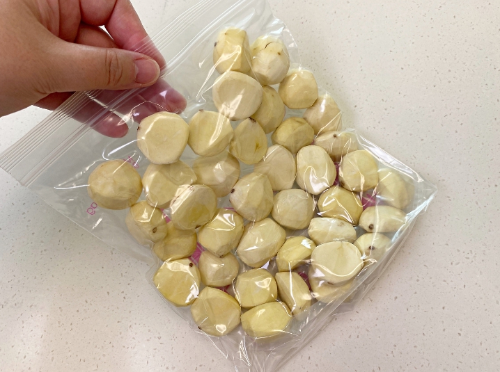 지퍼백에 깐밤을 최대한 겹치지 않게 담고요.