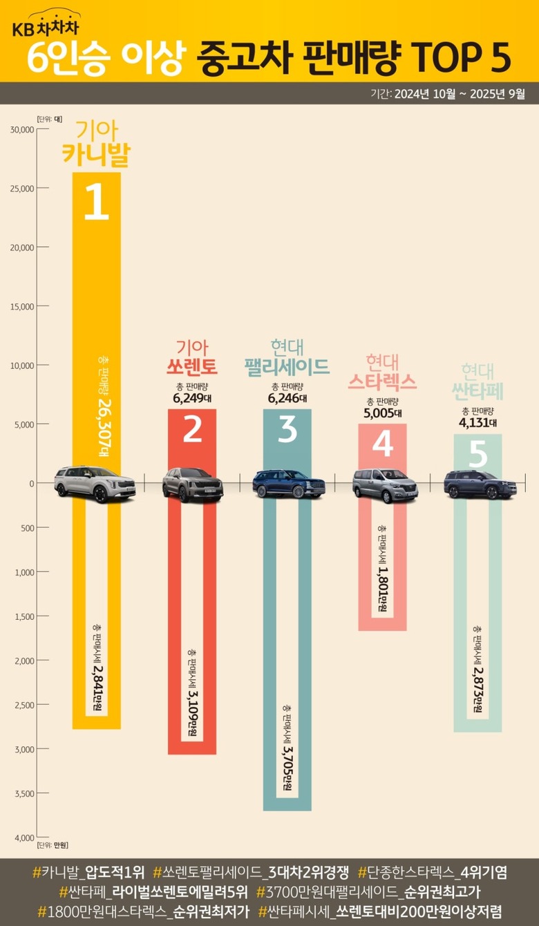 ‘넘사벽 1위’ 카니발, 그럼 2위는? 6인승 이상 중고차 판매량 순위