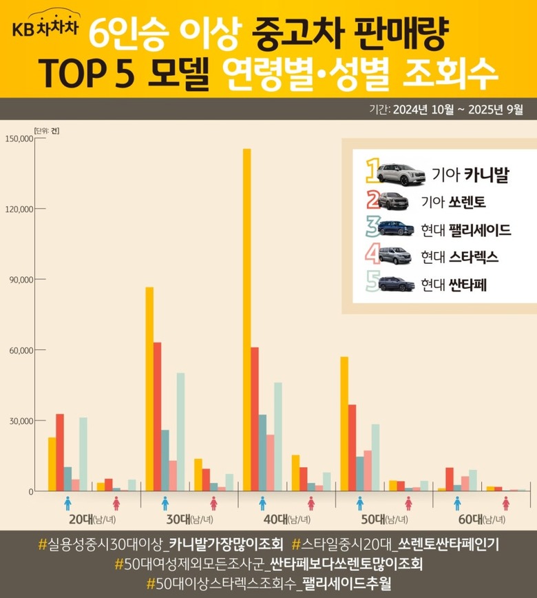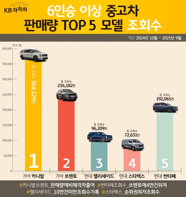 다둥이 가족의 최애 패밀리카는 역시 카니발이었다. 최근 1년간 6인승 이상 중고차 판매량 조사에서 카니발이 압도적 1위를 차지했으며, 쏘렌토와 팰리세이드가 그 뒤를 이었다.