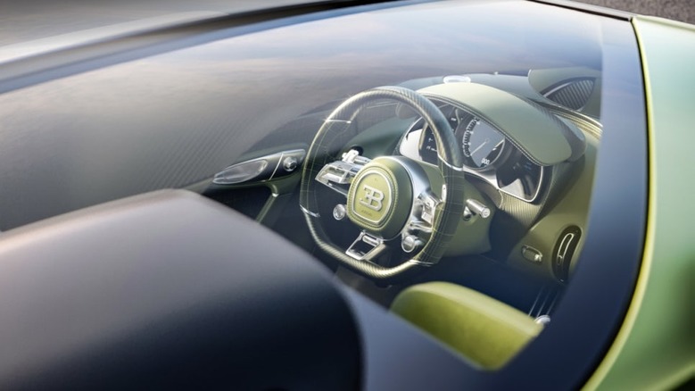 특히 투명 유리 지붕을 통해 실내로 자연광이 쏟아지기 때문에 인테리어 요소의 조형미가 극대화됩니다. 부가티 특유의 운전석과 조수석을 가르는 척추라인은 겉모습에서부터 실내로 이어져 조형적 통일감을 부여합니다.