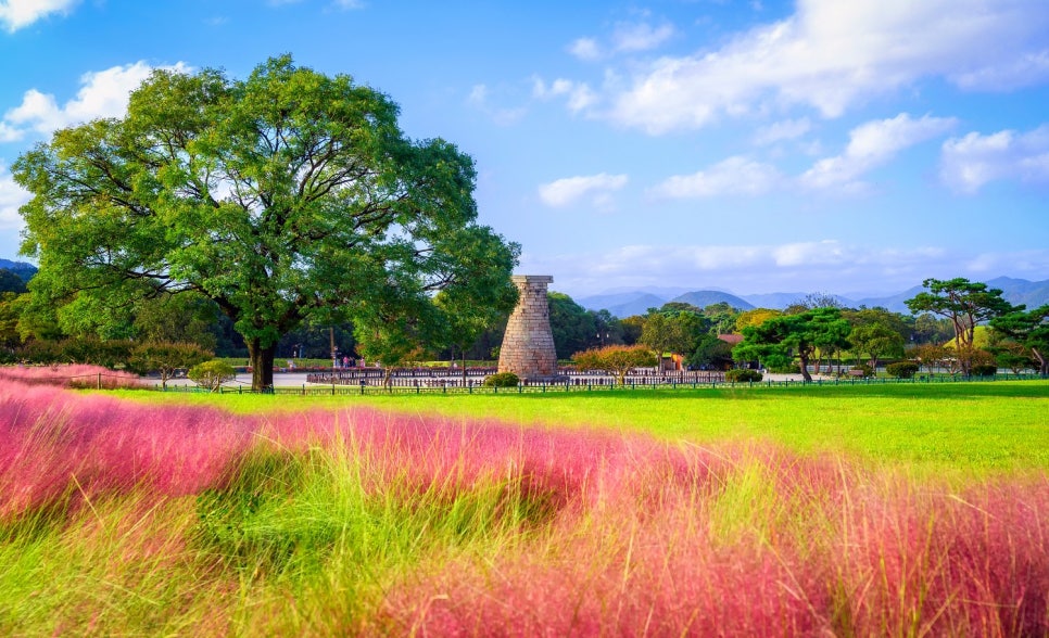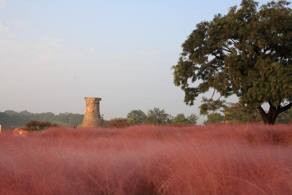 첨성대를 배경으로 분홍 물결이 펼쳐져