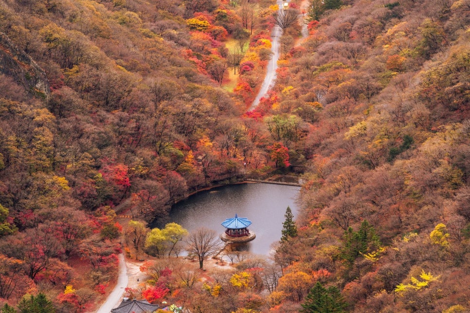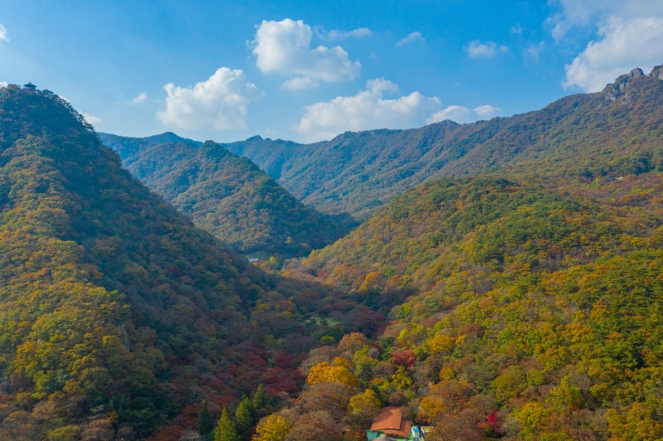 사찰 뒤편으로 펼쳐진 단풍 숲길은