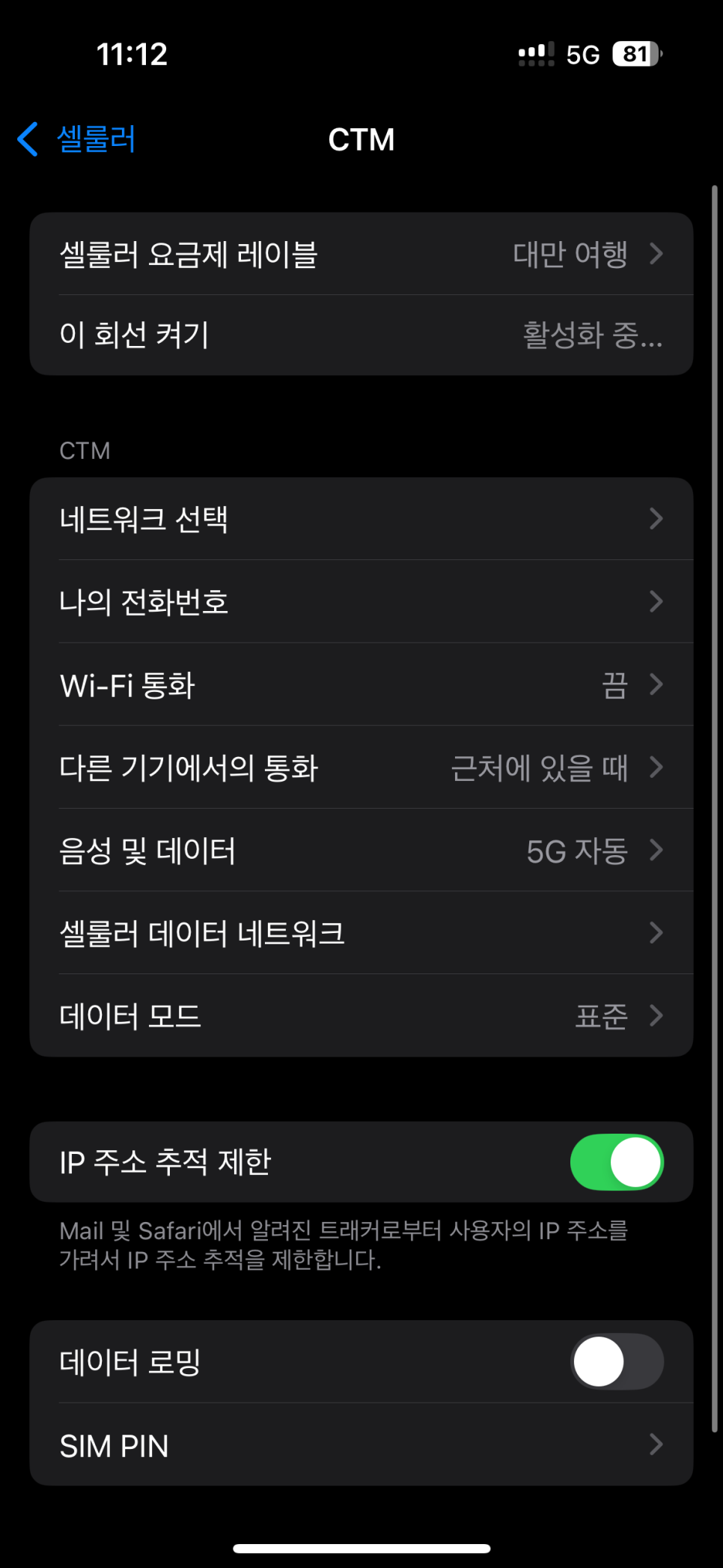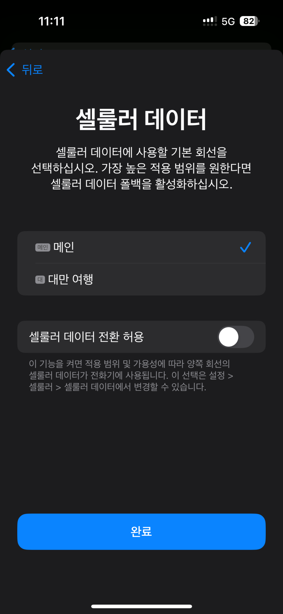5️⃣ 도착 후 셀룰러 > 보조 회선에서 데이터 로밍 ON