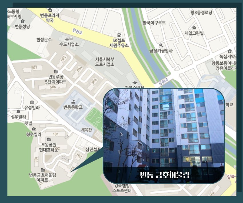 금호아파트는 서울 번화가인 종로까지 자동차로는 46분, 대중교통으론 50분의 거리에 위치하고 있다. 인근에 위치한 아파트들도 비슷하거나 이보다 낮은 실거래가를 보인다. 구체적으로 번동주공4단지 아파트는 전 5억 4,700만 원(전용 77㎡), 바로 옆에 있는 오동공원현대홈타운(전용 84㎡)은 4억 6,000만 원을 호가한다.