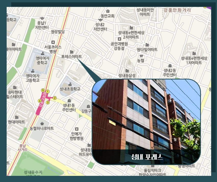 포레스의 경우 종로까지 자동차로는 25분, 대중교통으로는 약 40분이 소요된다. 총 3개동으로 이루어진 단지로 56세대가 거주하고 있다. 5호선 천호역까지는 9분, 8호선 강동구청역과는 4분 거리에 위치하고 있다. 인근에는 학교, 상가, 병원 등이 위치해 편리한 생활이 가능하다.