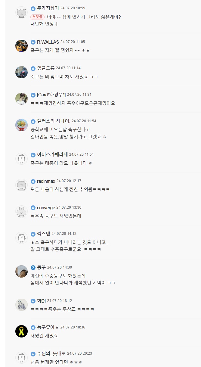 남편이 폭우 오는데 조기축구하러 간대요.. 의심해도되죠?by 뉴스낵 2025.09.30폭우축구부부본 콘텐츠의 저작권은 저자 또는 제공처에 있으며, 이를 무단 이용하는 경우 저작권법 등에 따라 법적 책임을 질 수 있습니다.