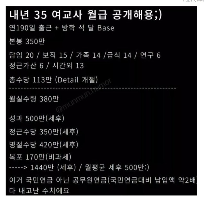 내년 35살 여교사 월급 공개.jpgby 뉴스낵 2025.10.24여교사월급여교사본 콘텐츠의 저작권은 저자 또는 제공처에 있으며, 이를 무단 이용하는 경우 저작권법 등에 따라 법적 책임을 질 수 있습니다.