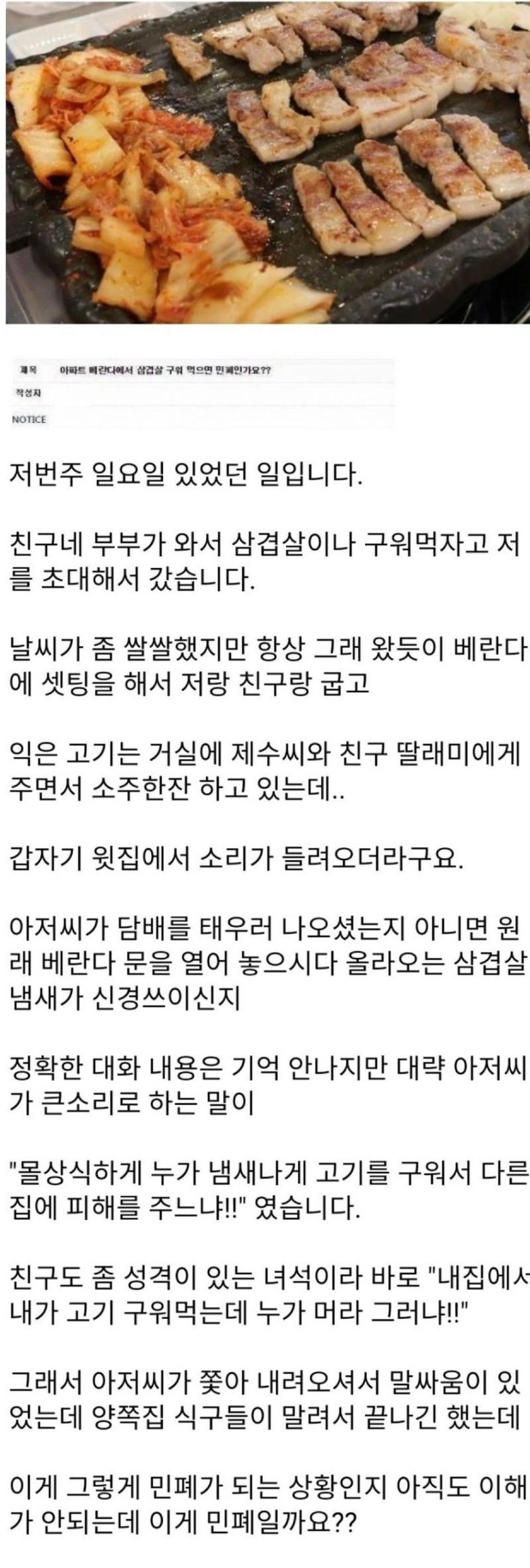 논란의 아파트 베란다 삼겹살.by 뉴스낵 2025.10.03베란다본 콘텐츠의 저작권은 저자 또는 제공처에 있으며, 이를 무단 이용하는 경우 저작권법 등에 따라 법적 책임을 질 수 있습니다.