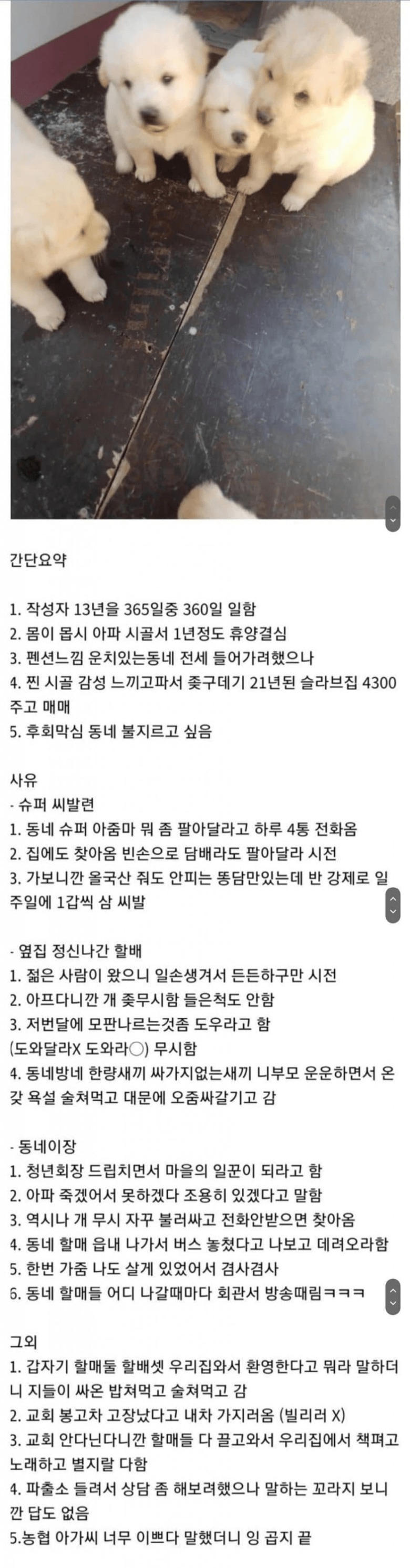 시골 귀촌한지 1년만에 뼈저리게 후회하는 청년,,,by 뉴스낵 2025.09.27귀촌시골본 콘텐츠의 저작권은 저자 또는 제공처에 있으며, 이를 무단 이용하는 경우 저작권법 등에 따라 법적 책임을 질 수 있습니다.