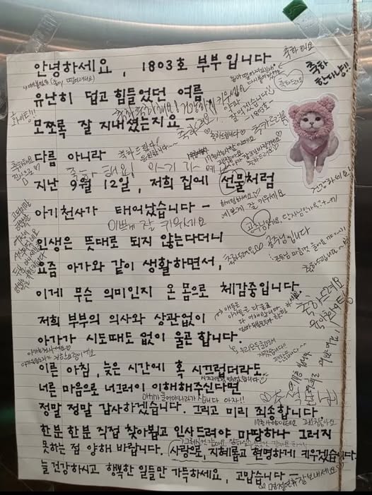어느 아파트의 따듯한 축하by 뉴스낵 2025.10.11아파트아파트이웃본 콘텐츠의 저작권은 저자 또는 제공처에 있으며, 이를 무단 이용하는 경우 저작권법 등에 따라 법적 책임을 질 수 있습니다.