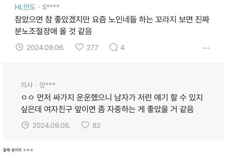 여친이 나보고 사이ㅋ패스래..by 뉴스낵 2025.10.25할아버지사이코패스연인싸움본 콘텐츠의 저작권은 저자 또는 제공처에 있으며, 이를 무단 이용하는 경우 저작권법 등에 따라 법적 책임을 질 수 있습니다.