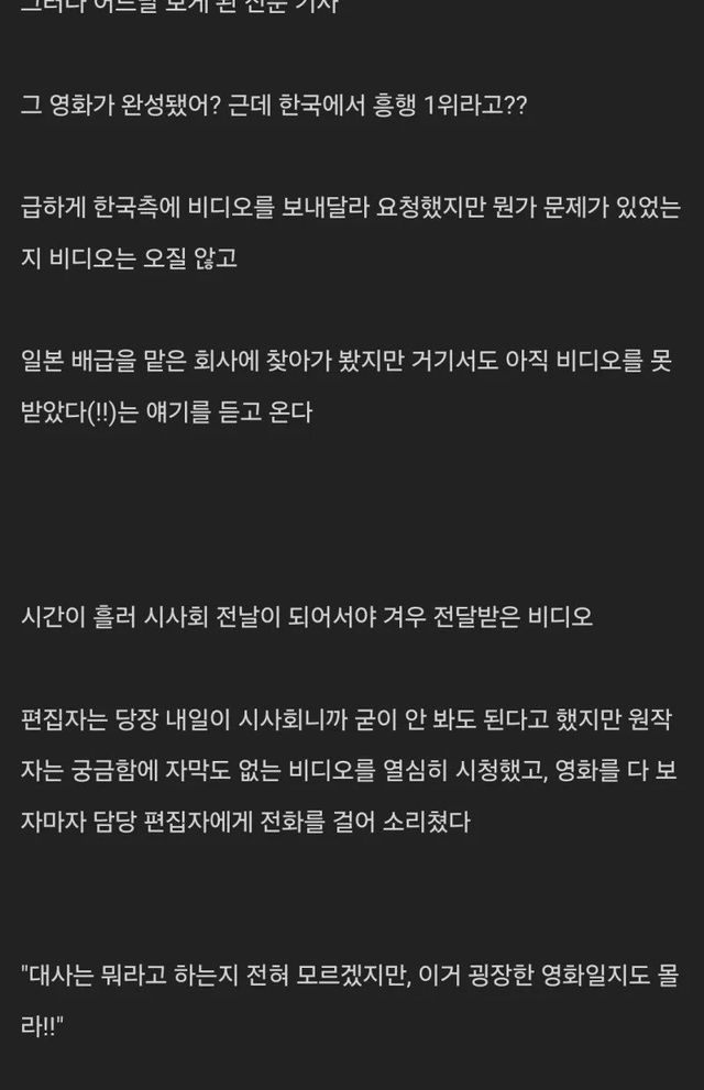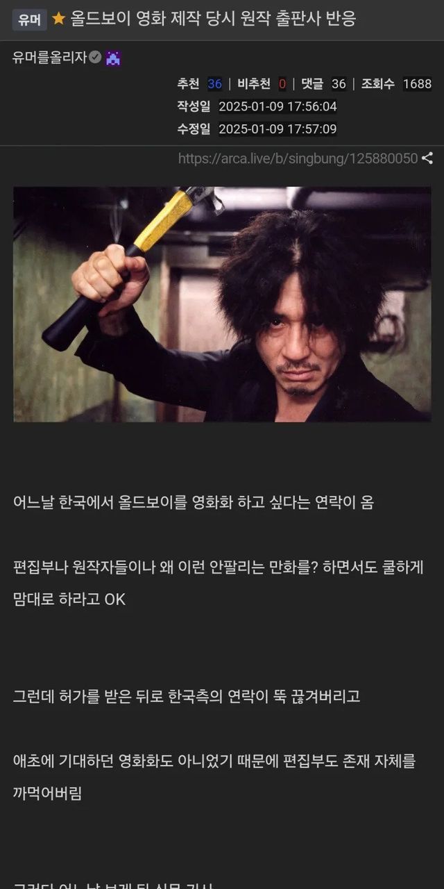 영화 '올드보이' 제작 당시 원작 출판사의 반응.by 뉴스낵 2025.03.29원문링크 바로가기이슈본 콘텐츠의 저작권은 저자 또는 제공처에 있으며, 이를 무단 이용하는 경우 저작권법 등에 따라 법적 책임을 질 수 있습니다.