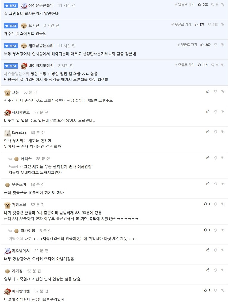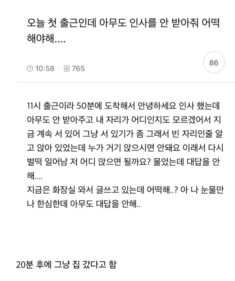 오늘 첫 출근인데 아무도 인사를 안 받아줘 어떡해야해....by 뉴스낵 2025.10.27회사직장첫출근본 콘텐츠의 저작권은 저자 또는 제공처에 있으며, 이를 무단 이용하는 경우 저작권법 등에 따라 법적 책임을 질 수 있습니다.