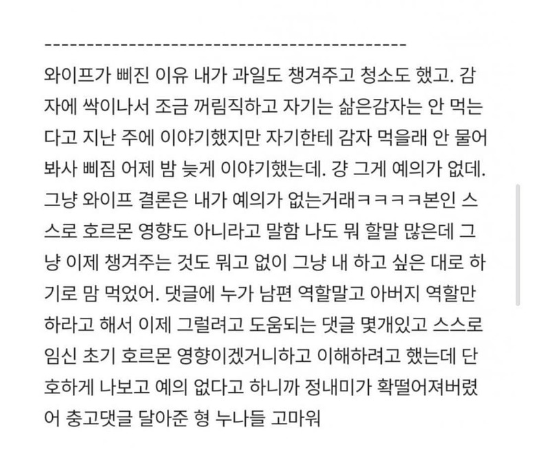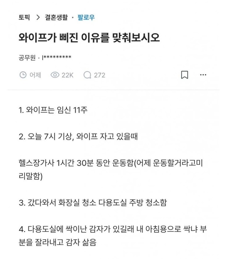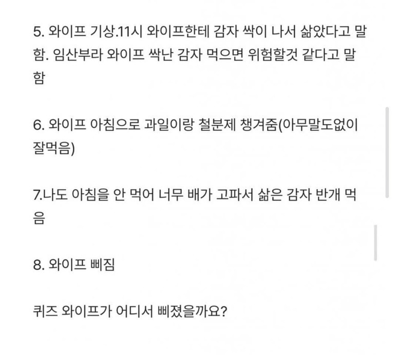 와이프가 삐진 이유를 맞춰보시오by 뉴스낵 2025.10.01아내본 콘텐츠의 저작권은 저자 또는 제공처에 있으며, 이를 무단 이용하는 경우 저작권법 등에 따라 법적 책임을 질 수 있습니다.