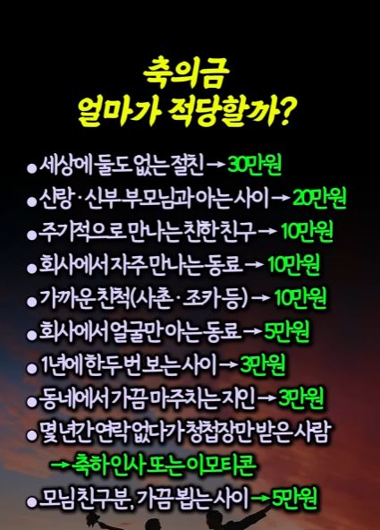 요즘 축의금 얼마가 적당할까?by 뉴스낵 2025.10.09축의금본 콘텐츠의 저작권은 저자 또는 제공처에 있으며, 이를 무단 이용하는 경우 저작권법 등에 따라 법적 책임을 질 수 있습니다.