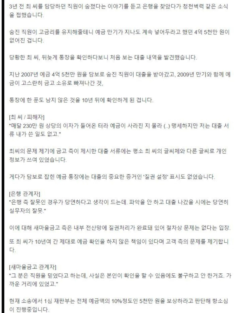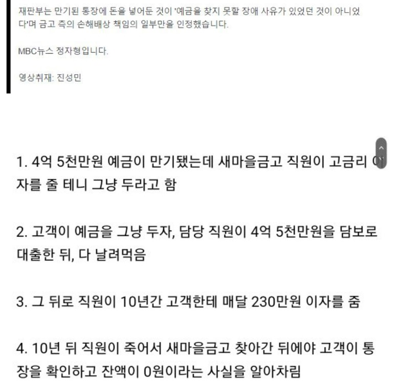 은행에 4억5천만원 맡겼는데 0원 됨by 뉴스낵 2025.09.27사기대출은행본 콘텐츠의 저작권은 저자 또는 제공처에 있으며, 이를 무단 이용하는 경우 저작권법 등에 따라 법적 책임을 질 수 있습니다.