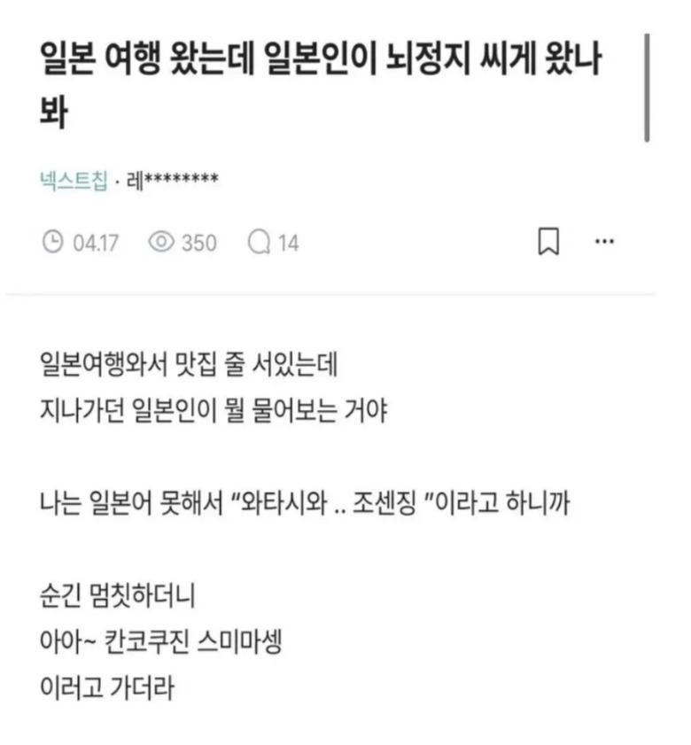 일본 여행 왔는데 일본인이 뇌정지 씨게 왔나봐by 뉴스낵 2025.10.26일본여행일본본 콘텐츠의 저작권은 저자 또는 제공처에 있으며, 이를 무단 이용하는 경우 저작권법 등에 따라 법적 책임을 질 수 있습니다.