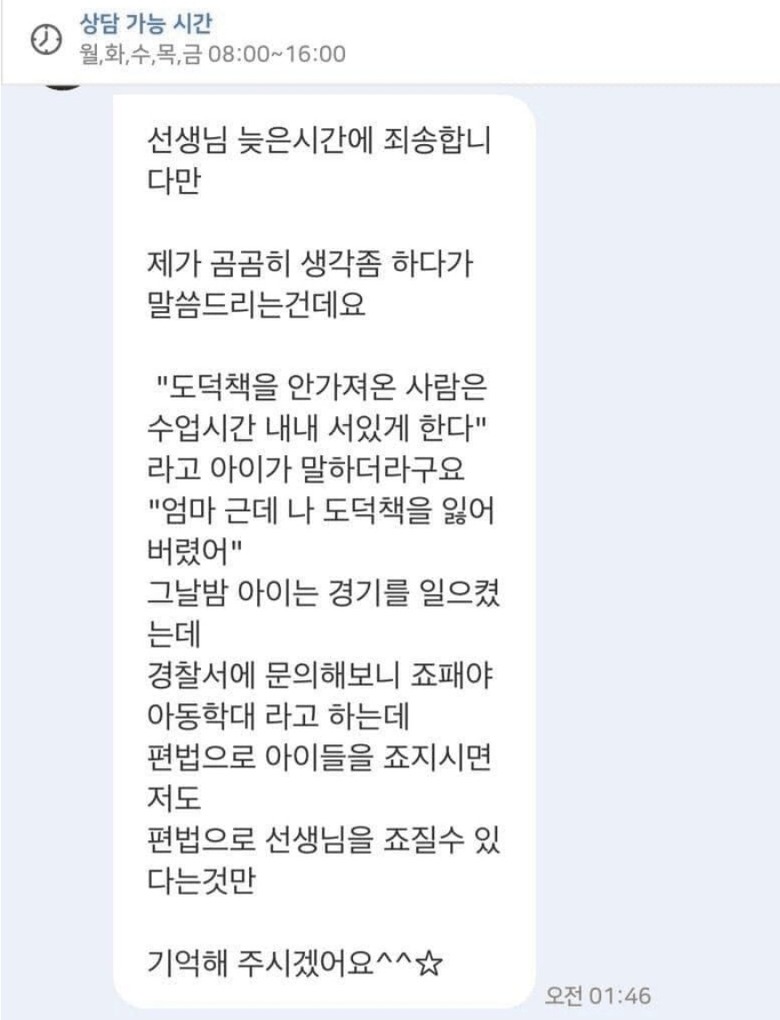 초등학교 교사가 받는 문자 수준 ㄷㄷby 뉴스낵 2025.10.07초등학교교사부모초등학교본 콘텐츠의 저작권은 저자 또는 제공처에 있으며, 이를 무단 이용하는 경우 저작권법 등에 따라 법적 책임을 질 수 있습니다.