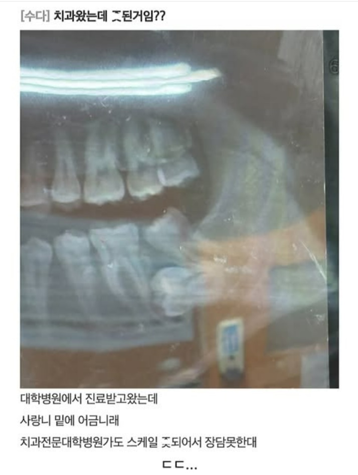 치과 왔는데 ㅈ된 거임?by 뉴스낵 2025.10.14사랑니어금니치과본 콘텐츠의 저작권은 저자 또는 제공처에 있으며, 이를 무단 이용하는 경우 저작권법 등에 따라 법적 책임을 질 수 있습니다.