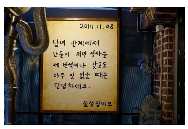 칠성집이모가 알려주는 정확한.. 남녀관계 명언by 뉴스낵 2025.09.30썸칠성집남녀관계본 콘텐츠의 저작권은 저자 또는 제공처에 있으며, 이를 무단 이용하는 경우 저작권법 등에 따라 법적 책임을 질 수 있습니다.