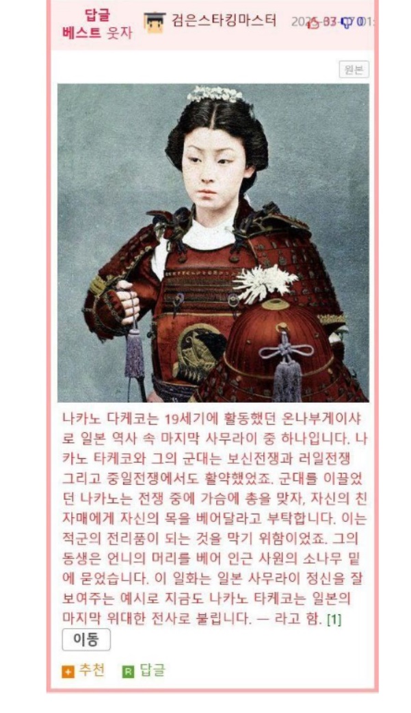 컬러로 복원했더니 놀라운 일본 '마지막 여성 사무라이'by 뉴스낵 2025.10.25일본사무라이일본여성사무라이본 콘텐츠의 저작권은 저자 또는 제공처에 있으며, 이를 무단 이용하는 경우 저작권법 등에 따라 법적 책임을 질 수 있습니다.