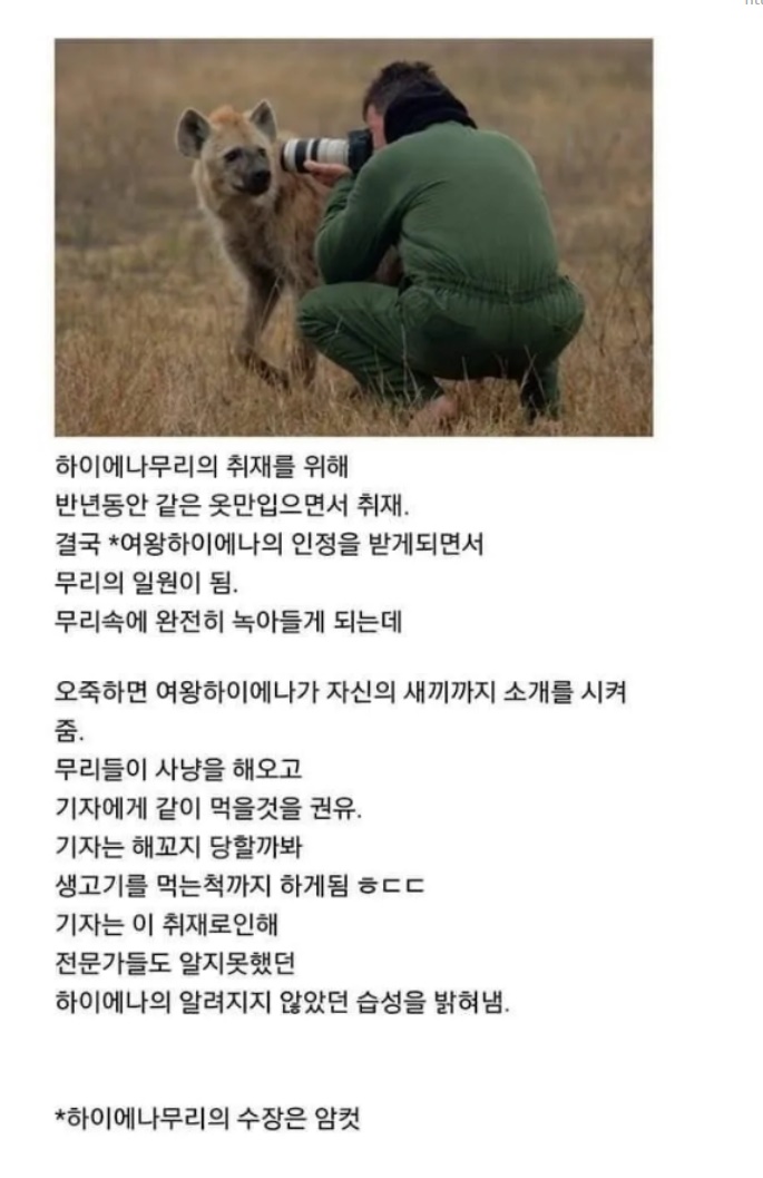 하이에나 우두머리에게 인정받은 기자ㄷㄷㄷby 뉴스낵 2025.09.28하이에나우두머리하이에나본 콘텐츠의 저작권은 저자 또는 제공처에 있으며, 이를 무단 이용하는 경우 저작권법 등에 따라 법적 책임을 질 수 있습니다.