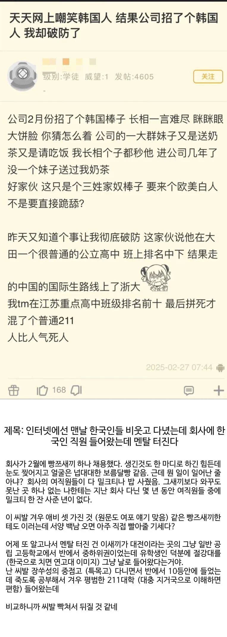 한국인 신입 때문에 개빡친 중국인by 뉴스낵 2025.10.18한국인회사썰중국인본 콘텐츠의 저작권은 저자 또는 제공처에 있으며, 이를 무단 이용하는 경우 저작권법 등에 따라 법적 책임을 질 수 있습니다.