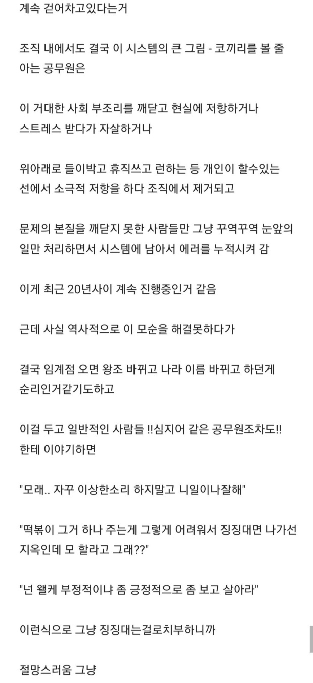 현직 공무원이 말하는 공공조직이 망해가는 근본적 이유by 뉴스낵 2025.10.18공무원문제공무원공공조직본 콘텐츠의 저작권은 저자 또는 제공처에 있으며, 이를 무단 이용하는 경우 저작권법 등에 따라 법적 책임을 질 수 있습니다.