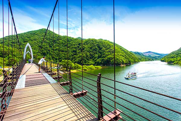 아름다운 괴산호를 바라보며 걸을 수 있어 길이 처음 만들어졌을 때부터 계속 인기가 높았다. 지루할 틈이 없이 고인돌 쉼터, 소나무 출렁다리 등 아기자기한 볼거리와 즐길 거리들이 곳곳에 들어서 있다. 산막이옛길을 둘러싸고 있는 등잔봉~천장봉 능선과 연계한 원점회귀 산행코스도 있어 각자 체력에 맞게 숲길을 즐길 수 있다. 산막이마을까지만 다녀오기 아쉽다면 연하협구름다리까지 다녀와도 좋다.