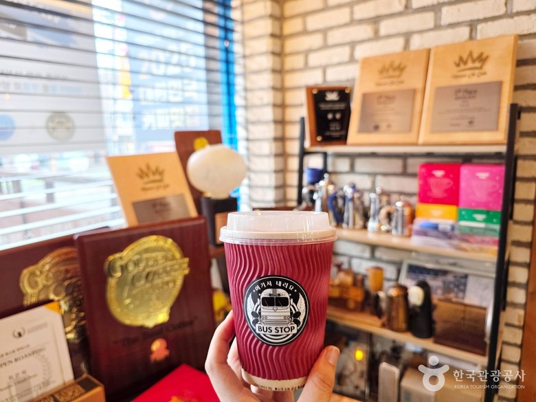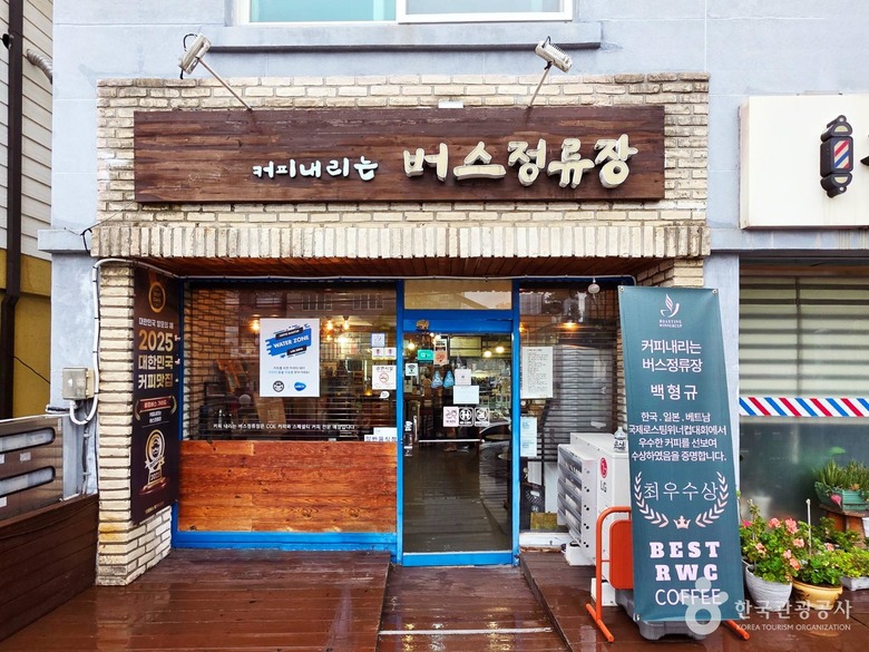 커피내리는 버스정류장은 정류장 앞에 자리한 작은 카페다. 외관은 동네 카페처럼 소박하지만, 내부에는 각종 바리스타 대회에서 수상한 상장과 상패가 가득하다. 매년 최고의 글로벌 카페를 선정하는 콜럼버스 가이드에서 ‘2025 대한민국 커피맛집’으로 선정되기도 했다.
