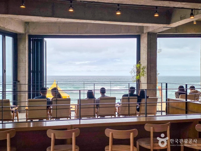 또 다른 매력은 경관에 있다. 건물 2층부터 루프탑까지 모든 공간에서 푸른 바다를 시원하게 조망할 수 있다. 루프탑에는 빈백 등 편안한 좌석이 마련되어 있어 아름다운 일몰을 바라보며 커피를 즐기기에도 좋다. 2층에는 반려견 동반이 가능한 공간도 있어 애견인들도 즐겨 찾는다.