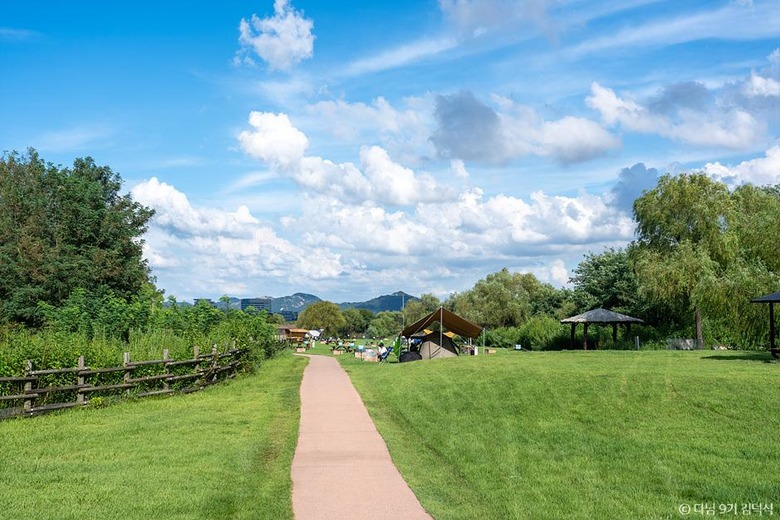 공원 내 잔디밭에 조성된 캠핑존은 푸르고 탁 트인 풍경을 자랑해요.