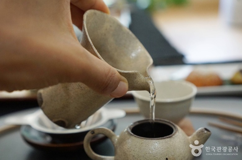 ![]() 숙우를 통해 물의 온도를 적당히 식힌 뒤 다관 속 찻잎을 우린다 |
